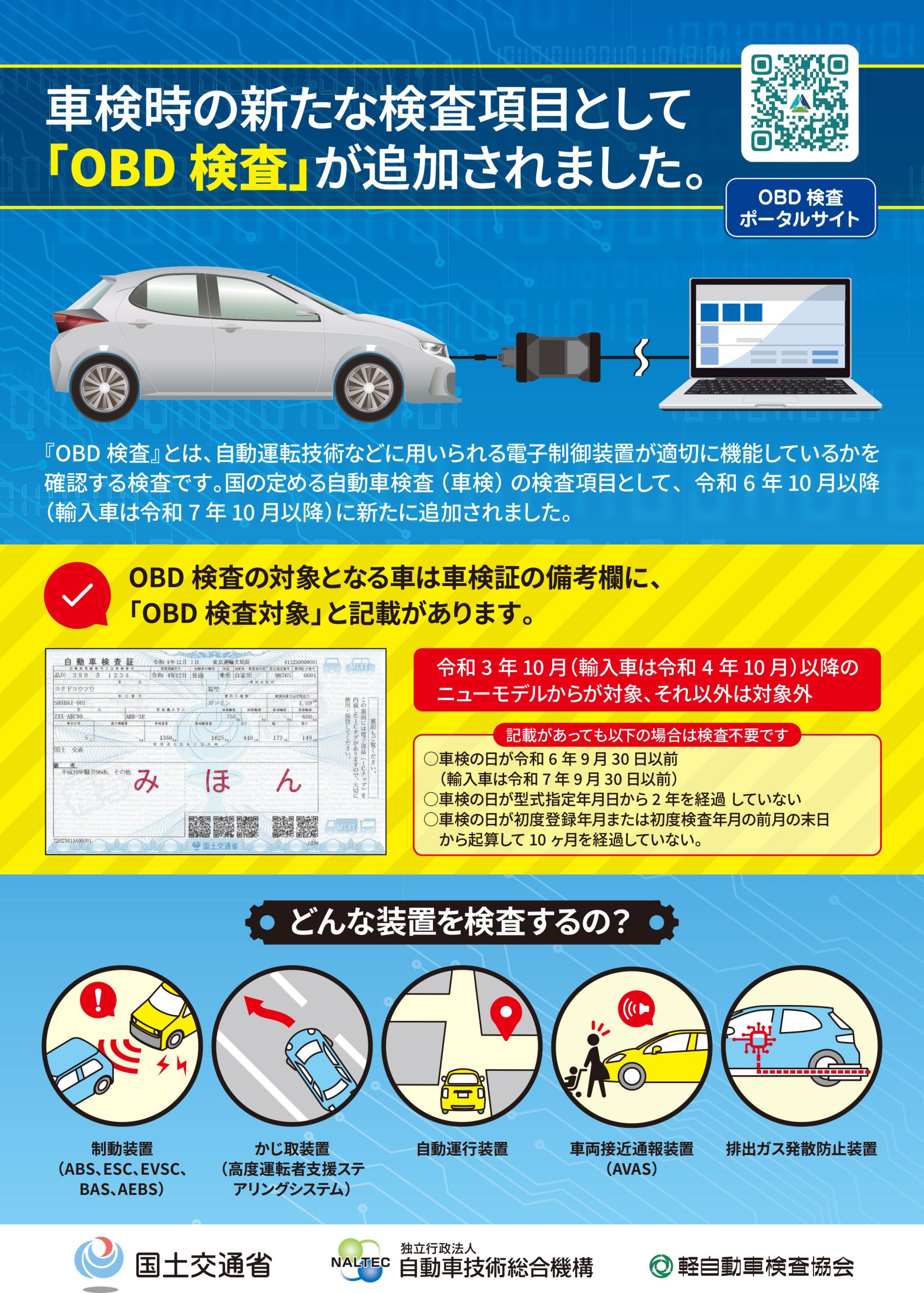 OBDの診断とは、簡単に言うと「車についているコンピューターの点検が義務付けられた」ことです。 コンピューターの誤作動による事故を未然に防ぐ目的があります。 重大事故を防ぐため、電子装置の機能確認が必要になりました。(令和6年10月より) 衝突被害軽減ブレーキのような、コンピューターの機能がついている車が対象になりますので、 今後、新車を購入される方をはじめ、すでにコンピューターの機能がついてる車に乗っている方は 弊社にお気軽にお申し付けください。