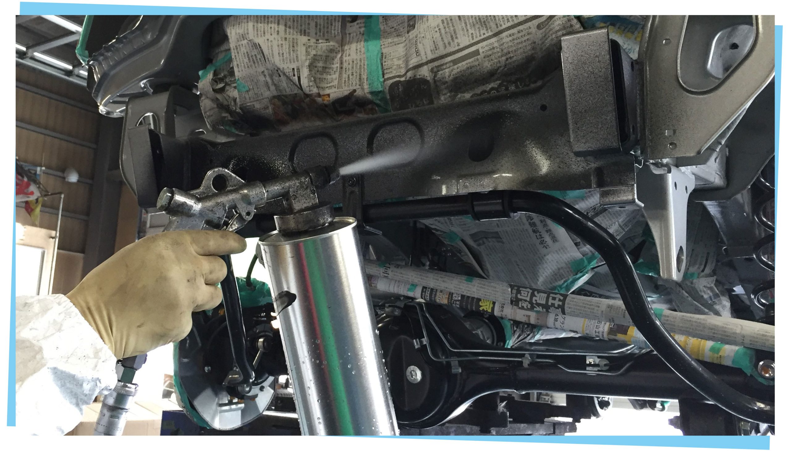 市成ボデーでは、JLMプロフェッショナルアンダーボディコート剤を使用しています。ゴム系の素材を使用した防錆・衝撃・防音コーティングで、愛車のアンダーボディを保護します。融雪剤、塩害、飛石、泥水完水に効果的です。新車入れ替えや、車検のタイミングで車のサビ対策をおススメします。